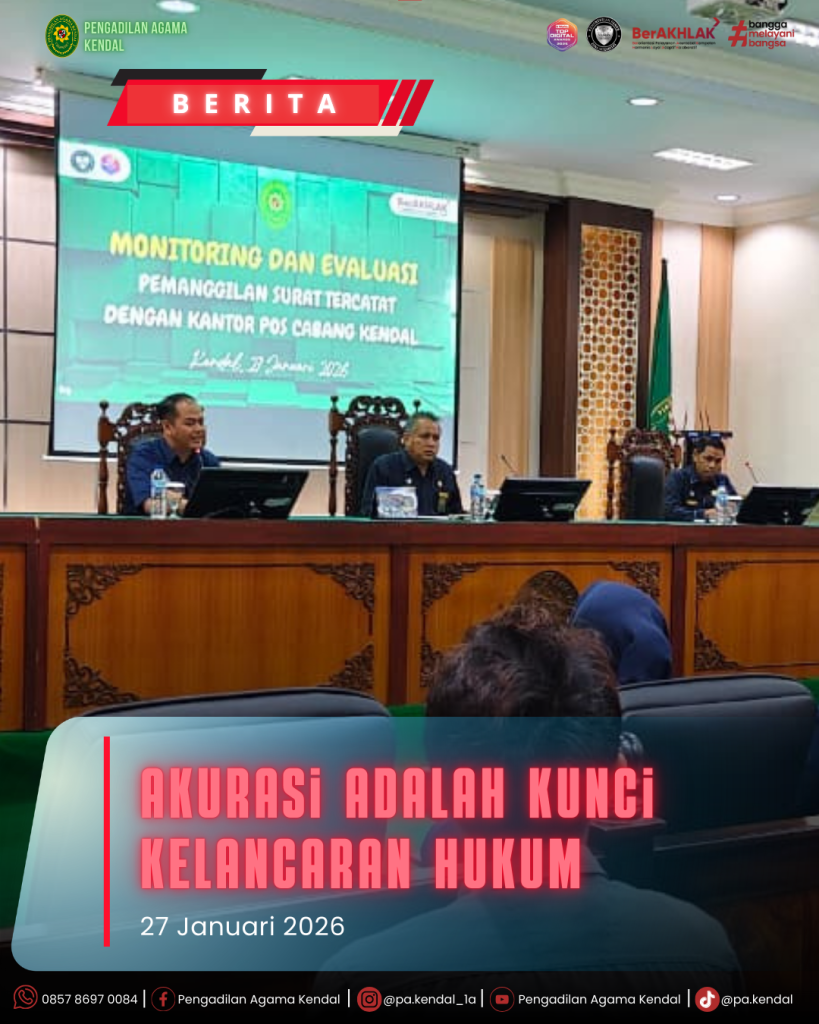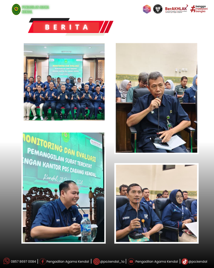 KENDAL – Selasa (27/01/2026), bertempat di Ruang Sidang Utama Pengadilan Agama (PA) Kendal, telah dilaksanakan rapat Monitoring dan Evaluasi (Monev) pelaksanaan pengiriman dokumen surat tercatat. Kegiatan yang dimulai sekitar pukul 08.30 WIB ini merupakan bentuk sinergi berkelanjutan antara PA Kendal dengan PT Pos Indonesia (Persero) Cabang Kendal dalam rangka memastikan proses persidangan berjalan efektif dan efisien sebagai jembatan menuju pelayanan peradilan yang prima.