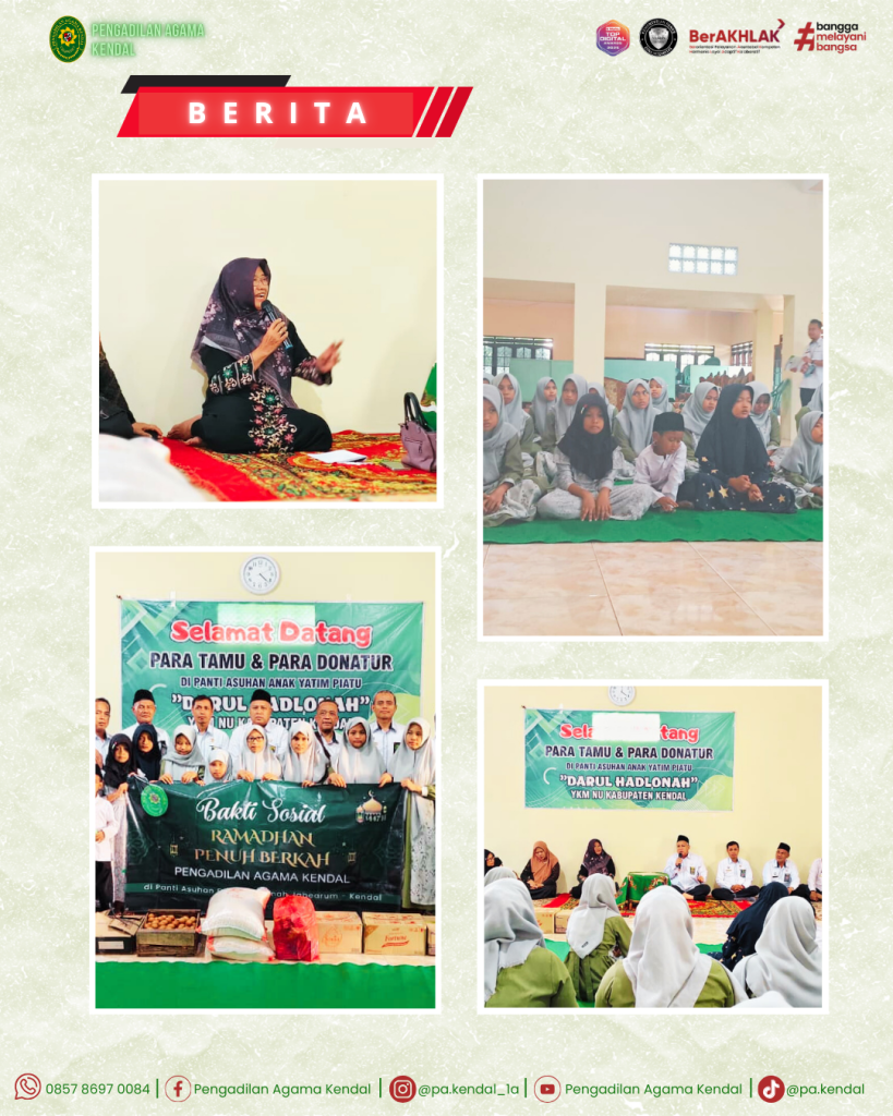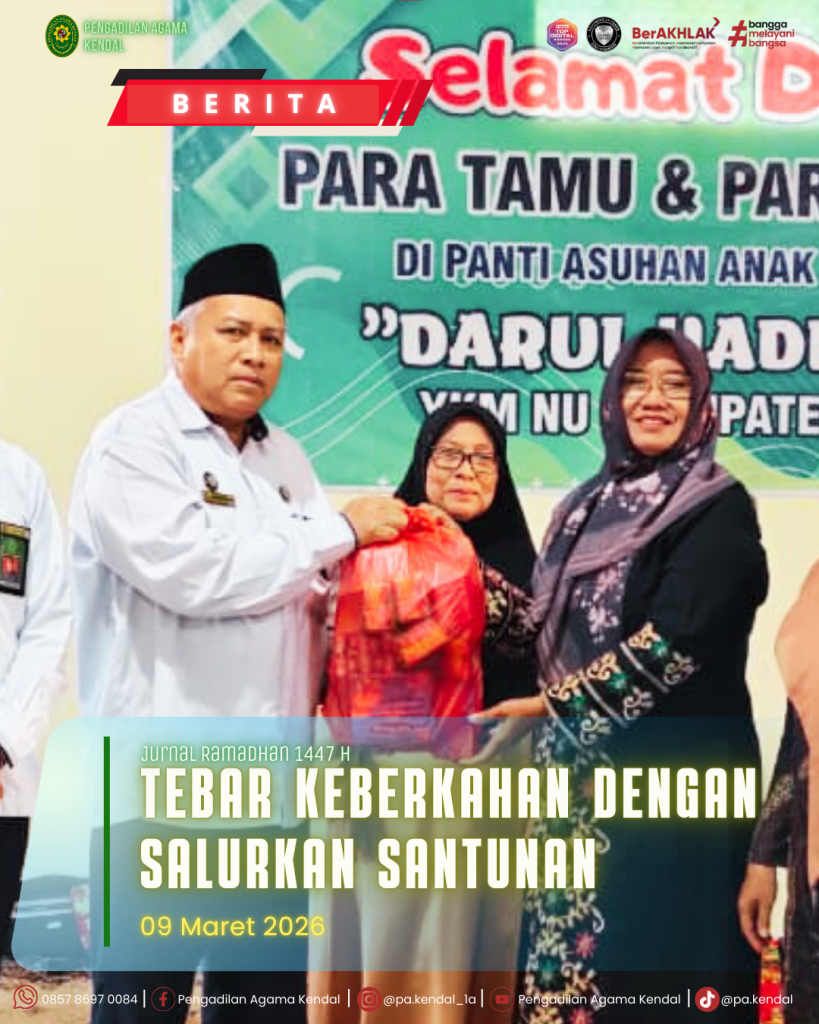KENDAL – Mengisi kemuliaan bulan suci Ramadhan 1447 H, keluarga besar Pengadilan Agama Kendal melaksanakan agenda rutin santunan anak yatim piatu pada Senin (09/03/2026) pukul 16.00 WIB. Bertempat di Panti Asuhan Putri Daarul Hadlonah, Jambearum, Kecamatan Patebon, kegiatan ini dihadiri langsung oleh jajaran pimpinan, perwakilan pegawai, serta pengurus Takmir Musholla Al-Hikmah PA Kendal. Acara dibuka dengan sambutan hangat dari pengurus panti yang menyampaikan apresiasi mendalam atas kepedulian yang terus konsisten diberikan oleh PA Kendal bagi para santriwati di panti tersebut.