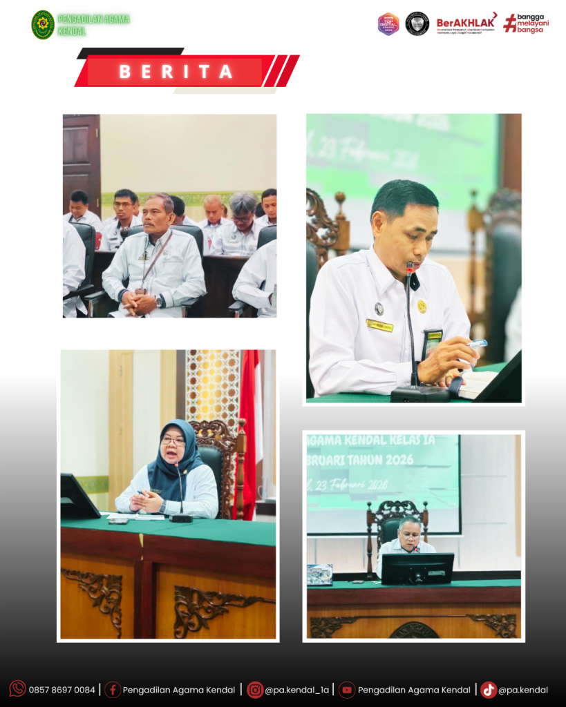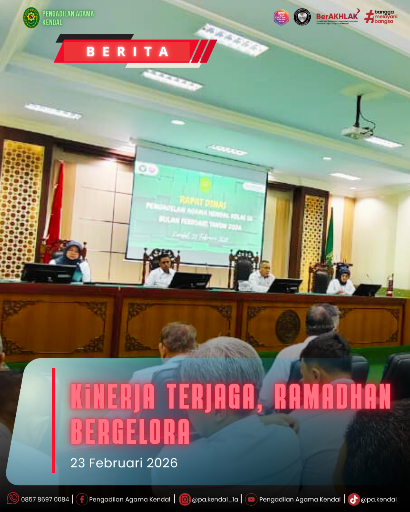 KENDAL – Pengadilan Agama Kendal menyelenggarakan rapat dinas pada Senin (23/02) bertempat di Ruang Media Center yang dipimpin langsung oleh Ketua PA Kendal dan dihadiri oleh jajaran Hakim, pejabat struktural, fungsional, serta seluruh staf. Dalam arahannya, pimpinan menekankan bahwa momentum Ramadan harus dijadikan pemacu profesionalisme, sehingga meskipun dalam kondisi berpuasa, kualitas pelayanan publik dan penyelesaian perkara melalui sistem elektronik tetap terjaga secara maksimal.